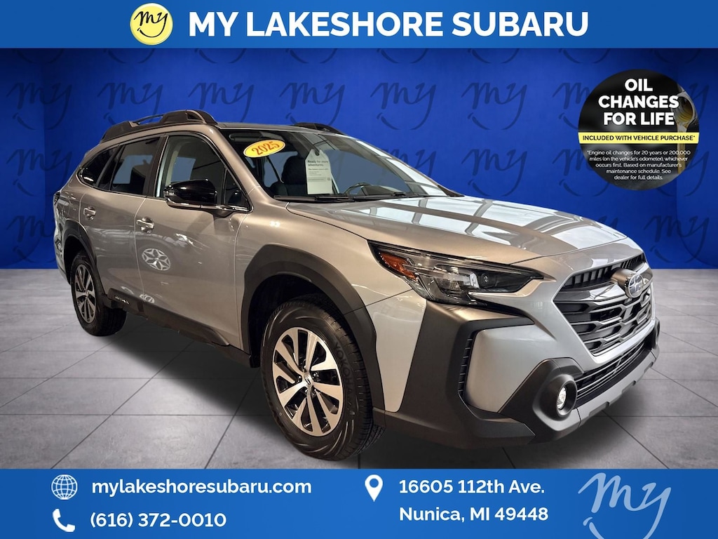 Outback Premium, Ice Silver Metallic, *ALL WHEEL DRIVE*, *APPLE CARPLAY & ANDROID AUTO*, *BACKUP CAMERA*, *EYESIGHT Driver Assist*, *HEATED SEATS*, *LANE DEPARTURE WARNING*, *MOONROOF*, *OIL CHANGES for LIFE*, Blind Spot Detection (BSD), BSD & RCTA & Keyless Access & Push Button Start, Hands-Free Power Rear Gate, Keyless Access w/Push Button Start, Power Moonroof, Radio: Subaru 11.6" Multimedia System w/Navigation, Rear Cross Traffic Alert (RCTA). Certified. Ice Silver Metallic 2025 Subaru Outback Premium AWD CVT Lineartronic 2.5L 4-Cylinder DOHC 16V