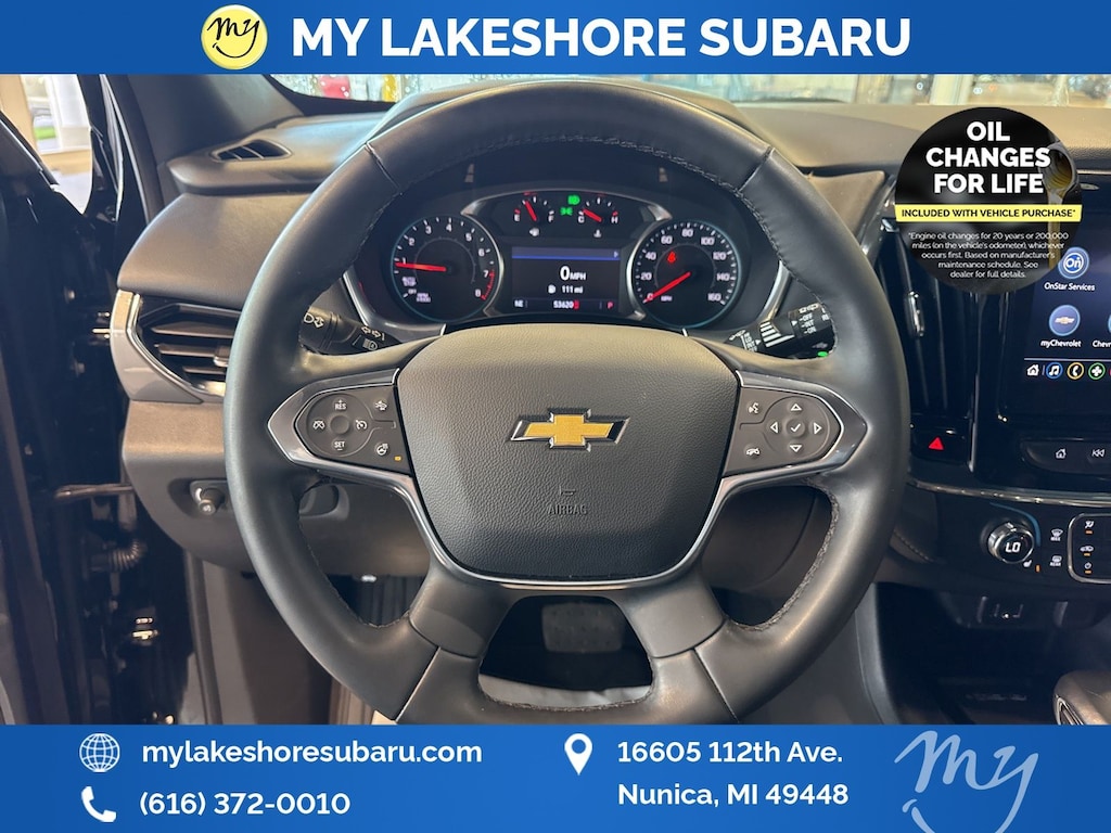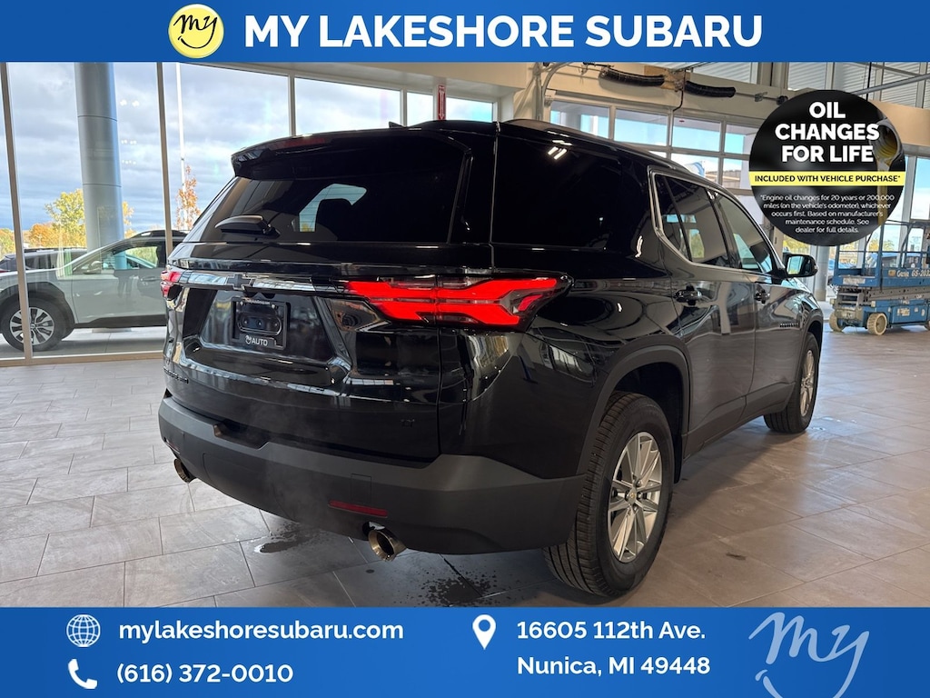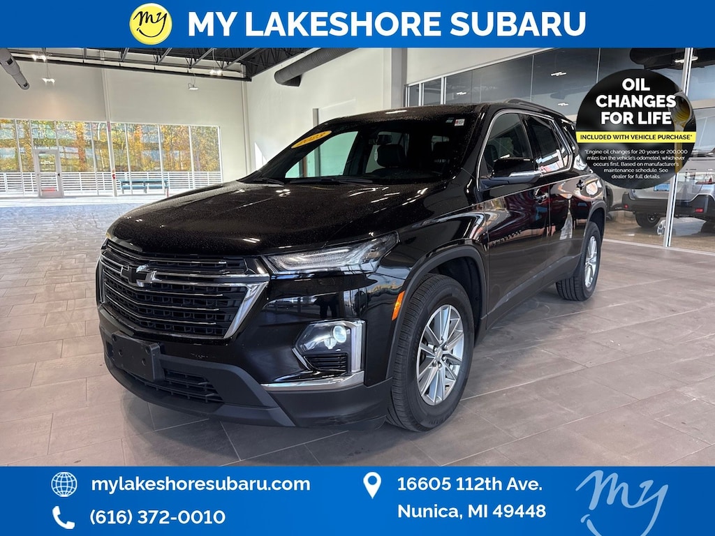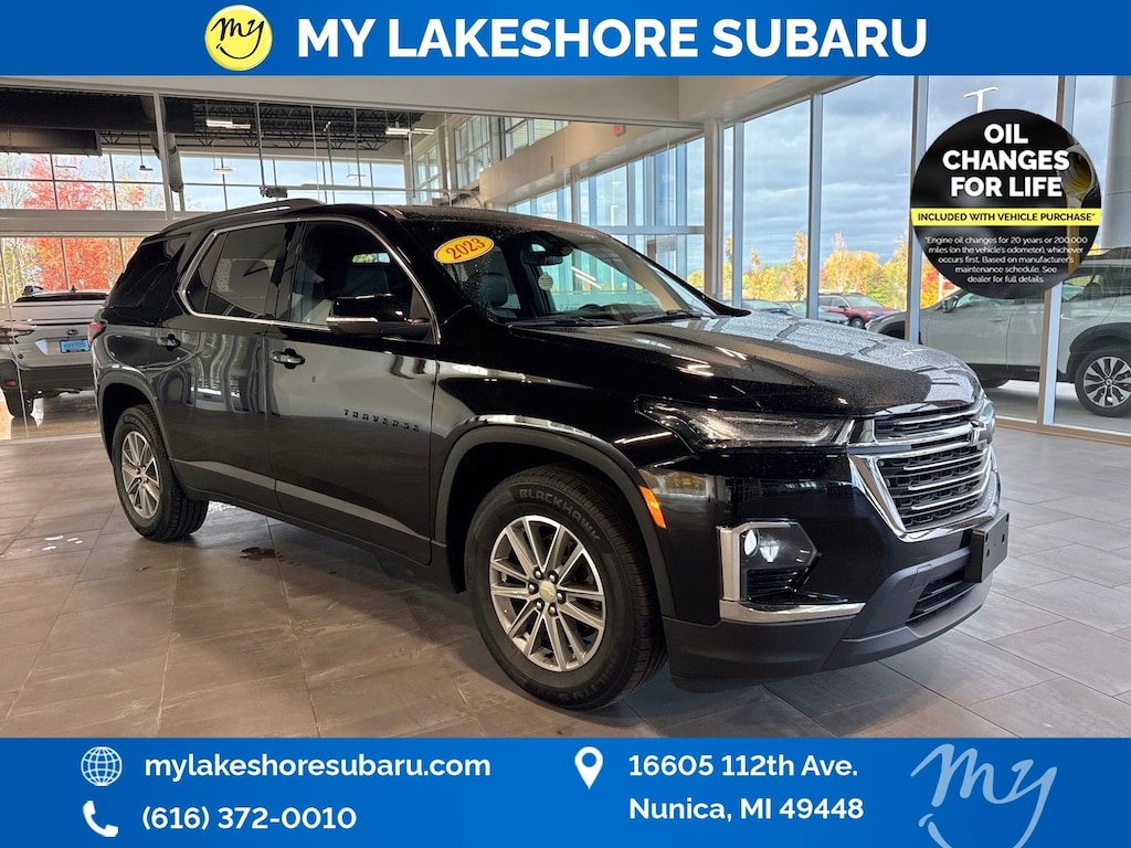 Traverse LT Leather, AWD, Mosaic Black Metallic, *ALL WHEEL DRIVE*, *APPLE CARPLAY & ANDROID AUTO*, *BLIND SPOT ALERT*, *LANE DEPARTURE WARNING*, *LEATHER HEATED POWER SEATS*, *OIL CHANGES for LIFE*. Mosaic Black Metallic 2023 Chevrolet Traverse LT Leather AWD 9-Speed Automatic 3.6L V6 SIDI VVT