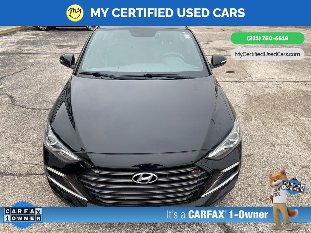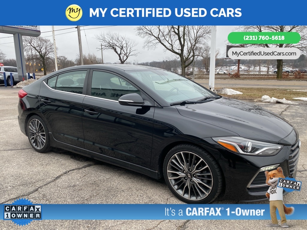 *SUPER BUY*, *VERY CLEAN* ***2018 HYUNDAI ELANTRA SPORT***, ***ONE OWNER***, *APPLE CARPLAY & ANDROID AUTO*, *BLIND SPOT MONITORING SYSTEM*, *HEATED SEATS*, *LANE DEPARTURE WARNING*, *LEATHER HEATED POWER SEATS*, *REARVIEW CAMERA*, *SUNROOF*, Apple CarPlay & Android Auto, Cargo Net, Cargo Package, Exterior Parking Camera Rear, Heated front seats, Heated Front Sport Seats, Leather Seating Surfaces, Option Group 01, Reversible Cargo Tray, Trunk Hooks. MY Certified Used Cars of Muskegon is your #1 choice in Michigan to get the BEST PRICE on used vehicles and BEST value for your trade. The MY Certified Used Cars team is ready to provide you with a world-class experience, ensuring that you find the perfect vehicle that fits all your needs. Every vehicle has been through a full safety inspection completed by certified technicians and fully detailed. We sell many makes and models, Pre-Owned Vehicles with years from 2025-2024-2023-2022-2021-2020-2019-2018-2017-2016-2015-2014-2013-2012-2011-2010-2009-2008-2007 and all makes Audi, BMW, Chevrolet, Toyota, Volkswagen, Kia, Hyundai, Mercedes, Dodge, Chrysler, Jeep, Ram, Lincoln, Honda, Subaru, and many models like Bronco, Bronco Sport, Edge, Escapes, Expedition, Explorer, Fusions, Focus, Flex, F-150 Series, F-250, F-350, Super Duty Diesel Trucks, Maverick, Mustang MACH-E, Mustang, Ranger, Transit, Wrangler, Grand Cherokee, Grand Cherokee L, Wagoneer, Gladiator, Grand Caravan, RAM, RAM HEMI, and more. Take advantage of our VIP experience by calling 231-760-5618 to schedule a test drive. Read our customer reviews at www.mycertifiedusedcars.com/testimonials or view our entire selection of preowned vehicles at www.mycertifiedusedcars.com, or stop by today, located at 3692 Airline Rd. Muskegon, MI 49444. CARFAX One-Owner. Black Noir Pearl 2018 Hyundai Elantra Sport FWD 7-Speed Automatic 1.6L Turbo GDI 4-Cylinder Clean CARFAX.