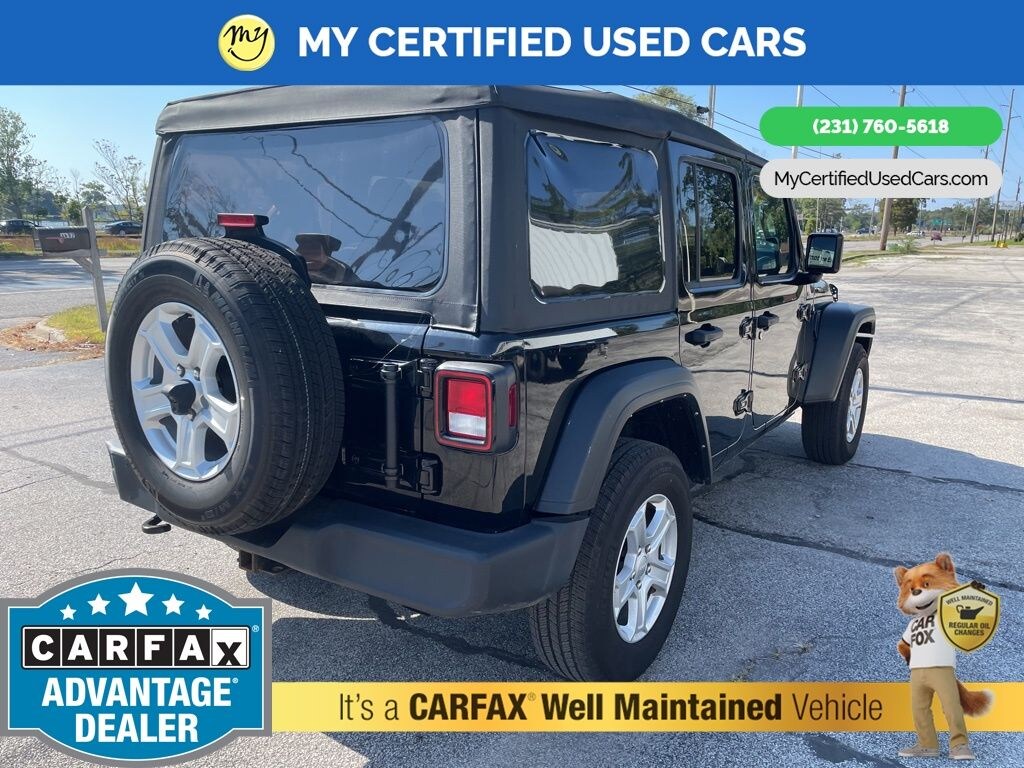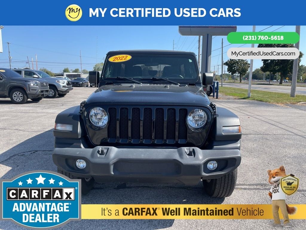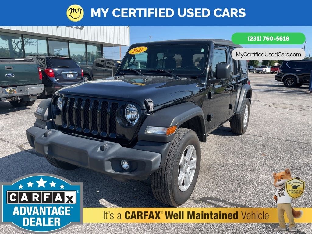 MY Certified Used Cars of Muskegon is your #1 choice in Michigan to get the BEST PRICE on used vehicles and BEST value for your trade. The MY Certified Used Cars team is ready to provide you with a world-class experience, ensuring that you find the perfect vehicle that fits all your needs. Every vehicle has been through a full safety inspection completed by certified technicians and fully detailed. We sell many makes and models, Pre-Owned Vehicles with years from 2025-2024-2023-2022-2021-2020-2019-2018-2017-2016-2015-2014-2013-2012-2011-2010-2009-2008-2007 and all makes Audi, BMW, Chevrolet, Toyota, Volkswagen, Kia, Hyundai, Mercedes, Dodge, Chrysler, Jeep, Ram, Lincoln, Honda, Subaru, and many models like Bronco, Bronco Sport, Edge, Escapes, Expedition, Explorer, Fusions, Focus, Flex, F-150 Series, F-250, F-350, Super Duty Diesel Trucks, Maverick, Mustang MACH-E, Mustang, Ranger, Transit, Wrangler, Grand Cherokee, Grand Cherokee L, Wagoneer, Gladiator, Grand Caravan, RAM, RAM HEMI, and more. Take advantage of our VIP experience by calling 231-760-5618 to schedule a test drive. Read our customer reviews at www.mycertifiedusedcars.com/testimonials or view our entire selection of preowned vehicles at www.mycertifiedusedcars.com, or stop by today, located at 3692 Airline Rd. Muskegon, MI 49444. CARFAX One-Owner. Black Clearcoat 2022 Jeep Wrangler Unlimited Sport S 4WD 8-Speed Automatic 2.0L I4 DOHC