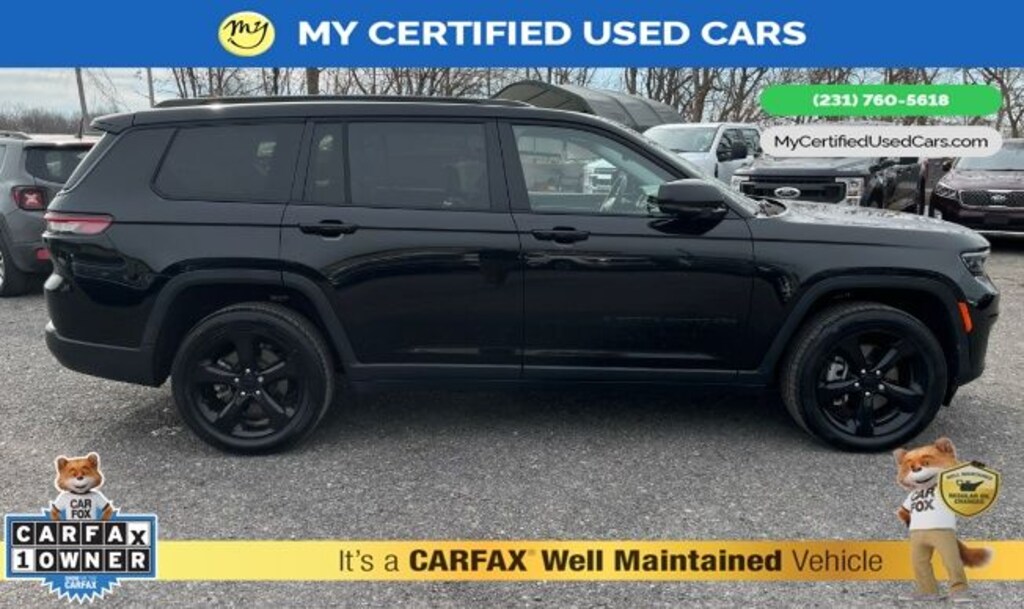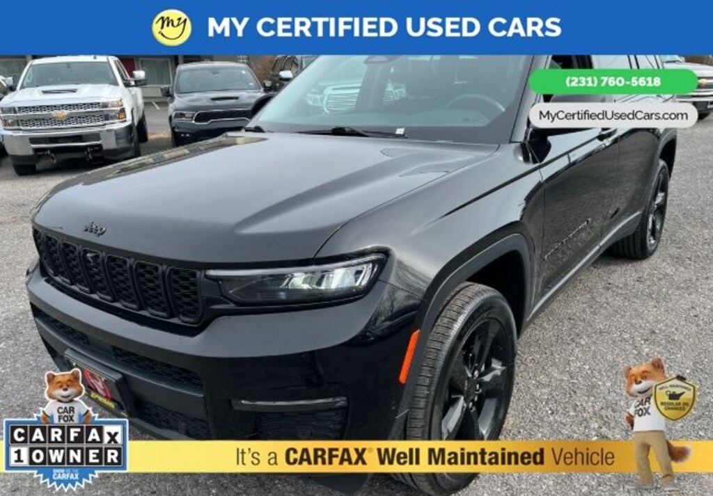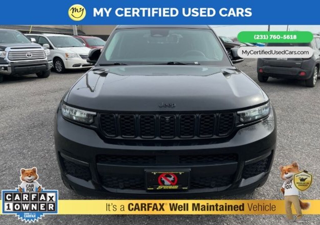 MY Certified Used Cars of Muskegon is your #1 choice in Michigan to get the BEST PRICE on used vehicles and BEST value for your trade. The MY Certified Used Cars team is ready to provide you with a world-class experience, ensuring that you find the perfect vehicle that fits all your needs. Every vehicle has been through a full safety inspection completed by certified technicians and fully detailed. We sell many makes and models, Pre-Owned Vehicles with years from 2025-2024-2023-2022-2021-2020-2019-2018-2017-2016-2015-2014-2013-2012-2011-2010-2009-2008-2007 and all makes Audi, BMW, Chevrolet, Toyota, Volkswagen, Kia, Hyundai, Mercedes, Dodge, Chrysler, Jeep, Ram, Lincoln, Honda, Subaru, and many models like Bronco, Bronco Sport, Edge, Escapes, Expedition, Explorer, Fusions, Focus, Flex, F-150 Series, F-250, F-350, Super Duty Diesel Trucks, Maverick, Mustang MACH-E, Mustang, Ranger, Transit, Wrangler, Grand Cherokee, Grand Cherokee L, Wagoneer, Gladiator, Grand Caravan, RAM, RAM HEMI, and more. Take advantage of our VIP experience by calling 231-760-5618 to schedule a test drive. Read our customer reviews at www.mycertifiedusedcars.com/testimonials or view our entire selection of preowned vehicles at www.mycertifiedusedcars.com, or stop by today, located at 3692 Airline Rd. Muskegon, MI 49444. CARFAX One-Owner. Diamond Black Crystal Pearlcoat 2023 Jeep Grand Cherokee L Limited 4WD 8-Speed Automatic 3.6L V6 24V VVT