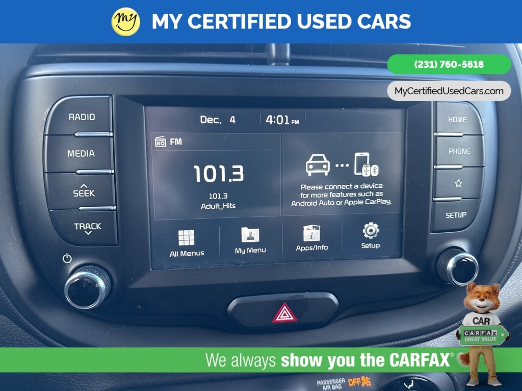 *SUPER BUY* ***2021 KIA SOUL LX***, *REMOTE START** **DRIVE MODE SELECT*** *APPLE CARPLAY & ANDROID AUTO*, *CROSS BARS*, *ROOF RACK* *CRUISE CONTROL*, *HANDSFREE BLUETOOTH*, *APPLE CARPLAY & ANDROID AUTO* *REARVIEW CAMERA* , Delay-off headlights, Exterior Parking Camera Rear, Fully automatic headlights, Remote keyless entry, Remote Start. MY Certified Used Cars of Muskegon is your #1 choice in Michigan to get the BEST PRICE on used vehicles and BEST value for your trade. The MY Certified Used Cars team is ready to provide you with a world-class experience, ensuring that you find the perfect vehicle that fits all your needs. Every vehicle has been through a full safety inspection completed by certified technicians and fully detailed. We sell many makes and models, Pre-Owned Vehicles with years from 2025-2024-2023-2022-2021-2020-2019-2018-2017-2016-2015-2014-2013-2012-2011-2010-2009-2008-2007 and all makes Audi, BMW, Chevrolet, Toyota, Volkswagen, Kia, Hyundai, Mercedes, Dodge, Chrysler, Jeep, Ram, Lincoln, Honda, Subaru, and many models like Bronco, Bronco Sport, Edge, Escapes, Expedition, Explorer, Fusions, Focus, Flex, F-150 Series, F-250, F-350, Super Duty Diesel Trucks, Maverick, Mustang MACH-E, Mustang, Ranger, Transit, Wrangler, Grand Cherokee, Grand Cherokee L, Wagoneer, Gladiator, Grand Caravan, RAM, RAM HEMI, and more. Take advantage of our VIP experience by calling 231-760-5618 to schedule a test drive. Read our customer reviews at www.mycertifiedusedcars.com/testimonials or view our entire selection of preowned vehicles at www.mycertifiedusedcars.com, or stop by today, located at 3692 Airline Rd. Muskegon, MI 49444. CARFAX One-Owner. Snow White Pearl 2021 Kia Soul LX FWD CVT 2.0L I4 MPI DOHC 16V LEV3-SULEV30 147hp