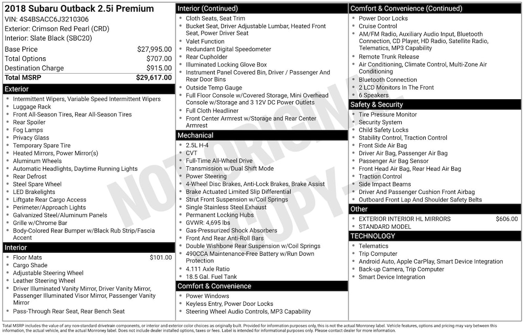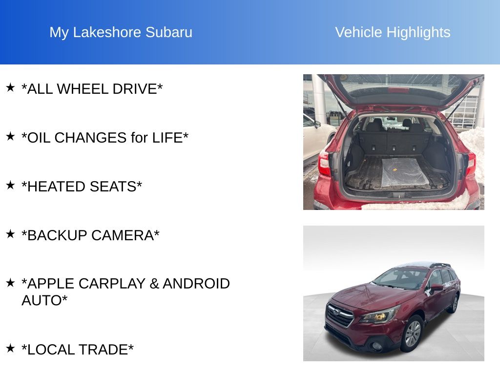 Outback 2.5i Premium, Crimson Red Pearl, *ALL WHEEL DRIVE*, *APPLE CARPLAY & ANDROID AUTO*, *BACKUP CAMERA*, *HEATED SEATS*, *LOCAL TRADE*, *OIL CHANGES for LIFE*. Crimson Red Pearl 2018 Subaru Outback 2.5i Premium AWD CVT Lineartronic 2.5L 4-Cylinder DOHC 16V