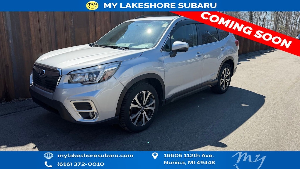 Forester Limited, Ice Silver Metallic, *ALL WHEEL DRIVE*, *APPLE CARPLAY & ANDROID AUTO*, *BACKUP CAMERA*, *BLIND SPOT MONITORING*, *EYESIGHT Driver Assist*, *LANE DEPARTURE WARNING*, *LEATHER HEATED POWER SEATS*, *LOCAL TRADE*, *OIL CHANGES for LIFE*, *PANORAMIC MOONROOF*. Ice Silver Metallic 2019 Subaru Forester Limited AWD Lineartronic CVT 2.5L 4-Cylinder DOHC 16V VVT