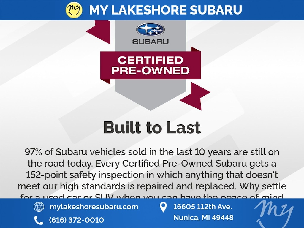 My Lakeshore Subaru is proud to service customer's saving you time & money on any Pre-owned vehicle! See dealer for complete details, dealer is not responsible for pricing errors, all prices, plus tax, title, plate, and doc fees. Serving Nunica and all of our surrounding cities like Norton Shores, Grandville, Greenville, Grand Rapids, Lansing, Kalamazoo, Walker, Comstock Park, Grand Haven, Holland, Wyoming, North Muskegon, Fruitport, Hudsonville, Spring Lake, Wolf Lake, Rockford, Zeeland, Kent City, Sparta, Coopersville, Allendale, Whitehall, and anywhere in the great state of Michigan. Buy from My Lakeshore Subaru in Nunica, MI and you will receive a best-in-class experience. Some of our used vehicles may be subject to unrepaired safety recalls. Check for a vehicle's unrepaired recalls by VIN at http://vinrcl.safercar.gov/vin/.